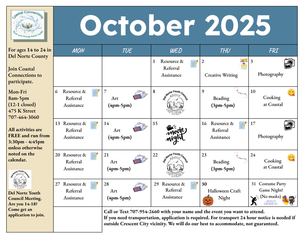 Coastal Connections is a youth and young adult resource center funded through the Mental Health Service Act (MHSA), staffed by Prevention Programs staff. The center serves youth and young adults, from 14 to 25 years old. The center provides both prevention and early intervention services with resources and referrals for needs that cannot be met directly on-site.