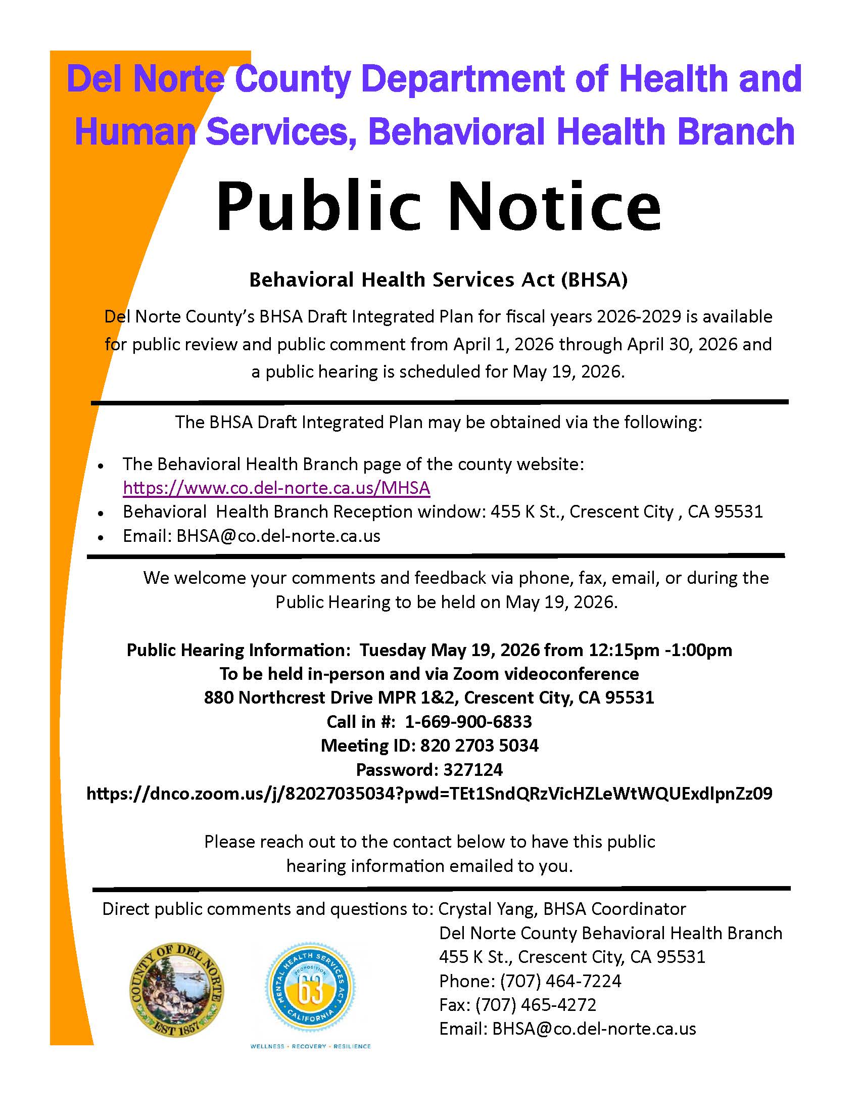 The County of Del Norte DHHS Behavioral Health Branch is pleased to share that the draft Behavioral Health Services Act (BHSA) Three-Year Integrated Plan for 2026–2029 is now available for public review and comment. The 30-day public comment period will be open from April 1, 2026 through April 30, 2026.